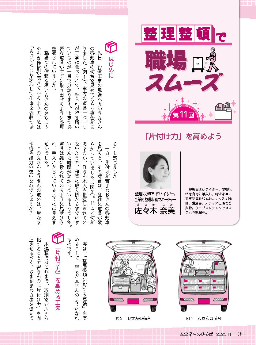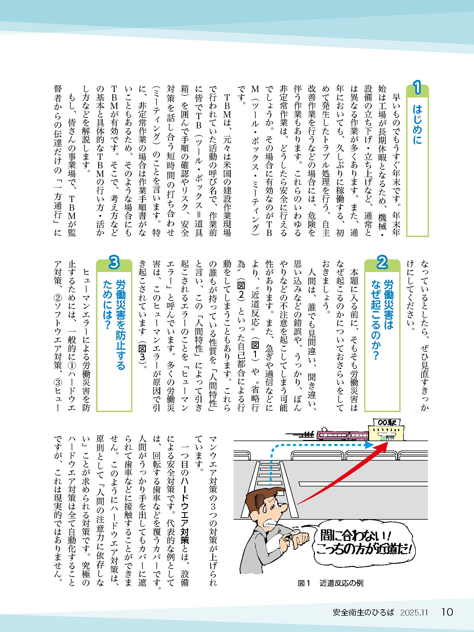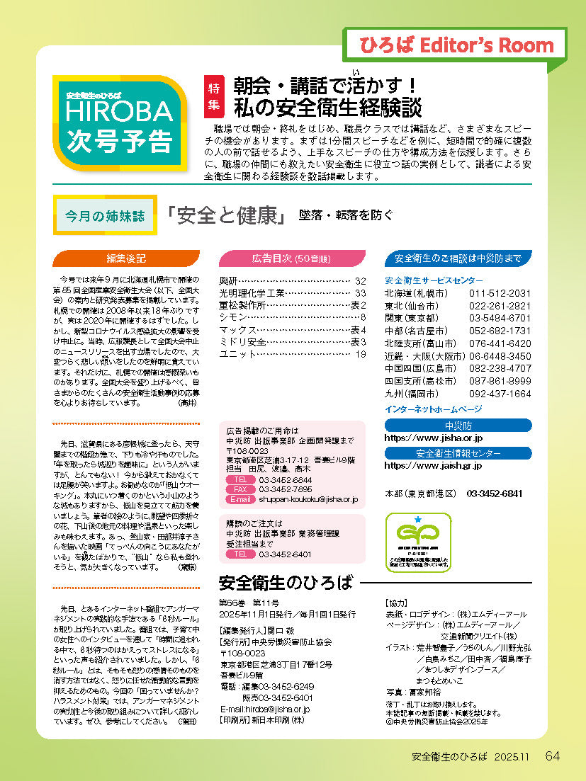 マンガポスターのデータの活用にあたって:「DLして使おう! マンガポスター」のイラストは、安全・健康に関する社内啓発用資料等の作成にご活用ください。ご使用の際は出典を明記してください(例:「安全衛生のひろば」(中災防)2025 年11月号から転載)。なお、商業利用、画像加工をしての使用はできません。