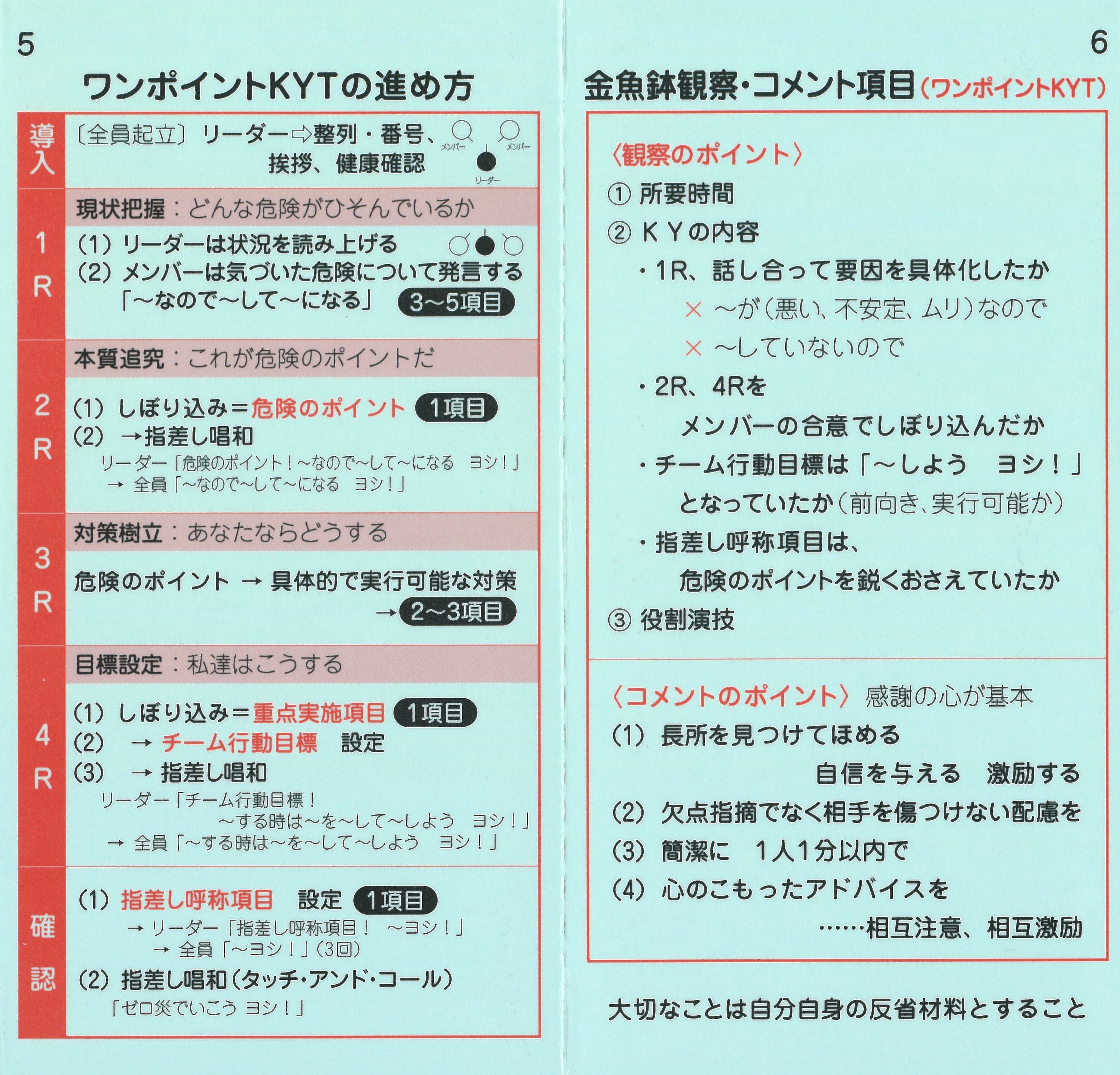 KYT基礎4ラウンド法、ワンポイントKYT等、KYTの各手法の進め方や模造紙の書き方、観察者がコメントするポイントをまとめたカード。胸ポケットに入るサイズで、実技はこのカードが1つあれば進められます。